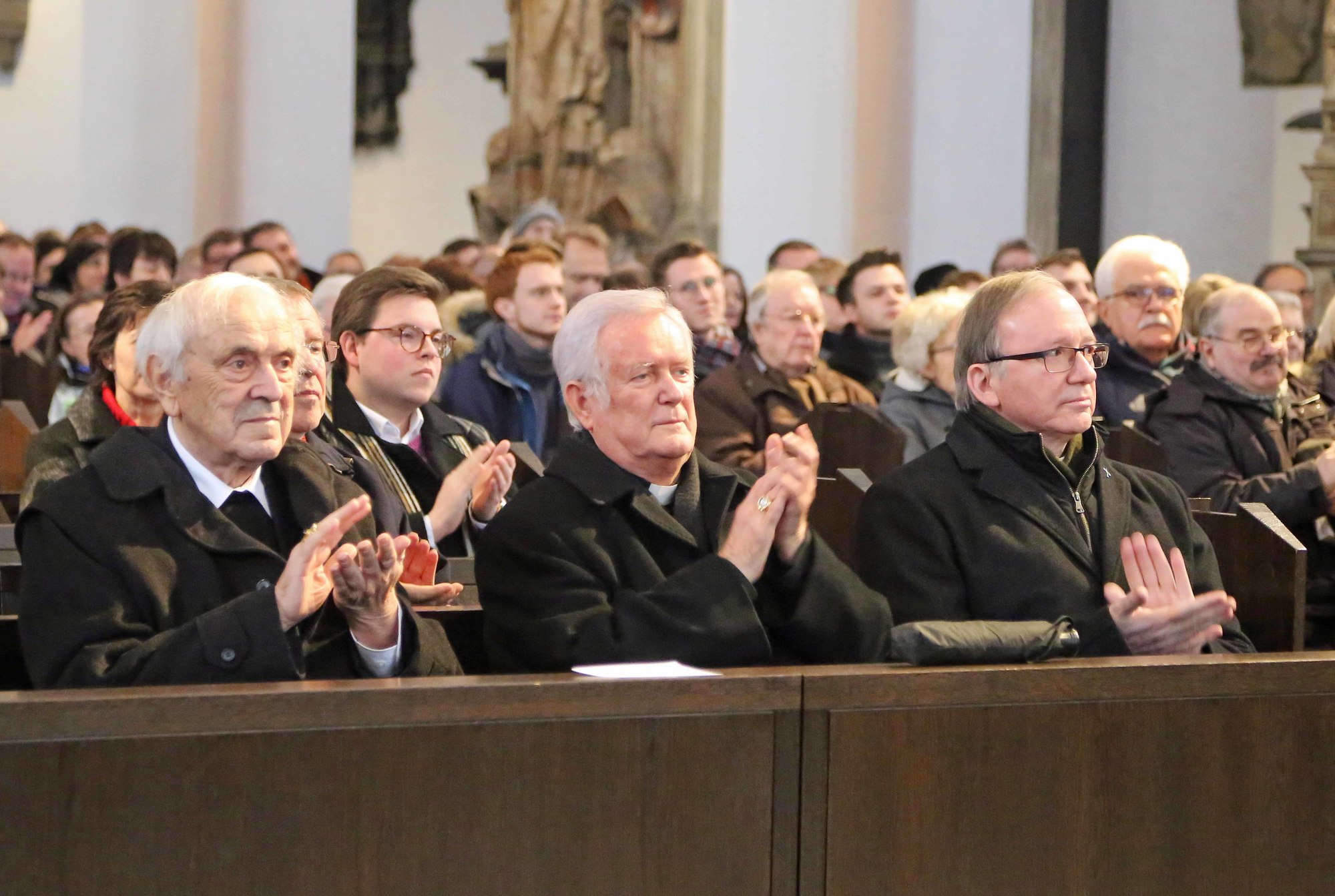 Der Zeitpunkt der Verkündigung war erst am Freitagmorgen bekannt geworden, doch die Nachricht verbreitete sich wie ein Lauffeuer. Die ersten Menschen sitzen bereits eine halbe Stunde vor der Verkündigung im Dom. Kurz vor Beginn des Angelus-Gebets haben sich fast 800 Menschen eingefunden. In den beiden vorderen Reihen haben das Würzburger Domkapitel und Bischof em. Dr. Friedhelm Hofmann Platz genommen. Fotografen und Kamerateams verfolgen jeden Moment des Geschehens. Während des Angelus-Gebets steigt die Spannung spürbar an, bis Weihbischof Boom das Schreiben von Erzbischof Eterović verliest.