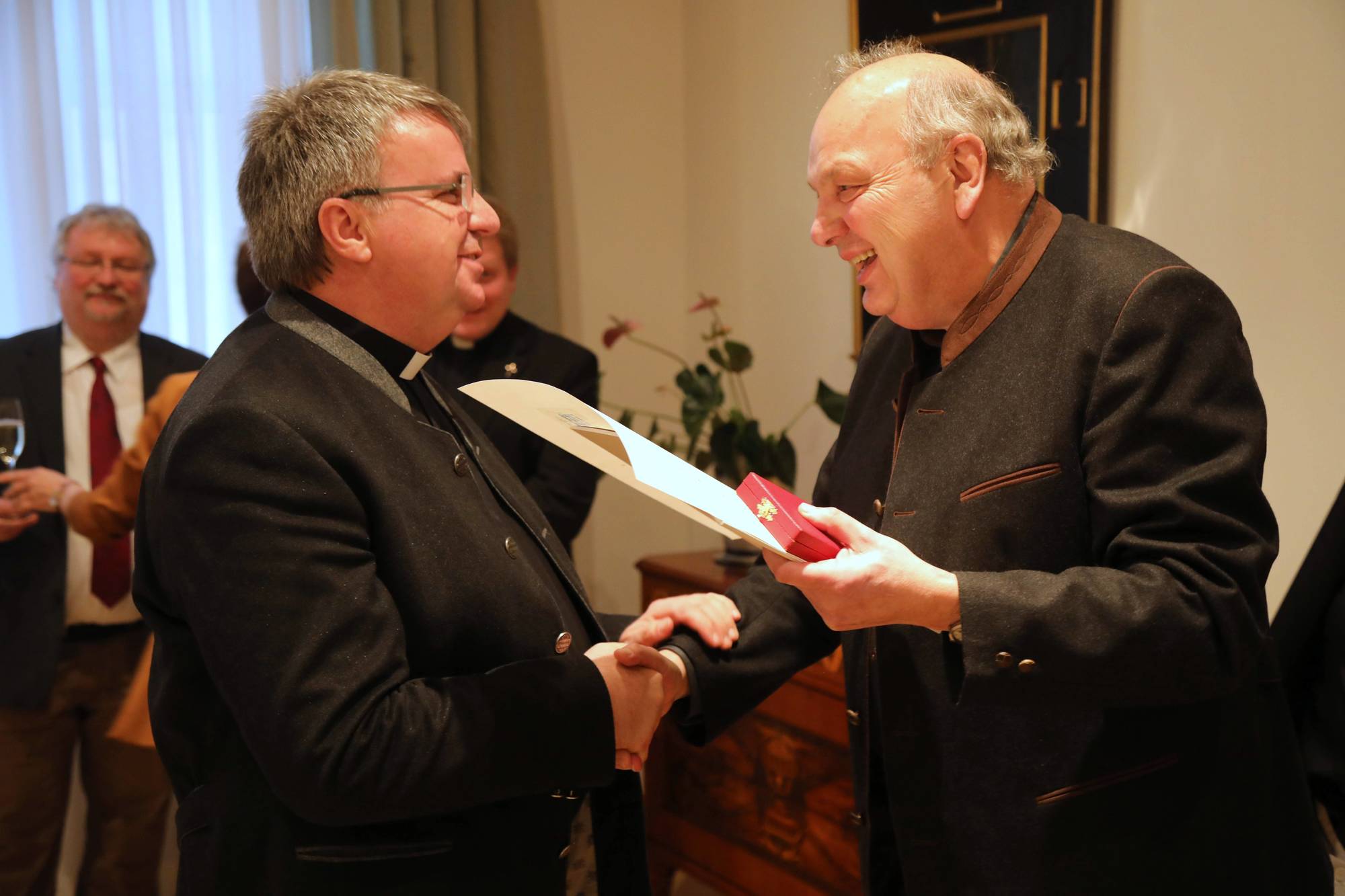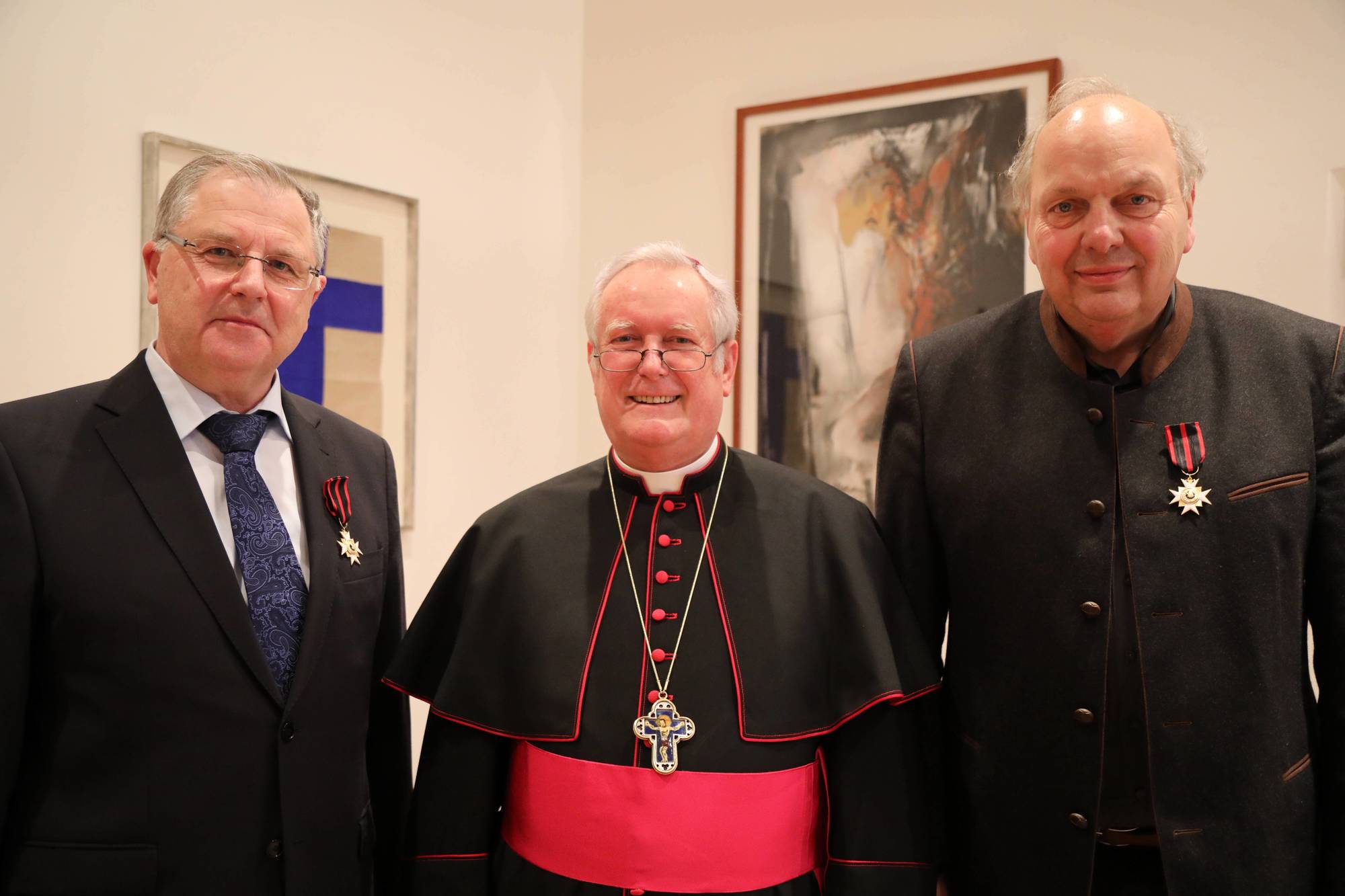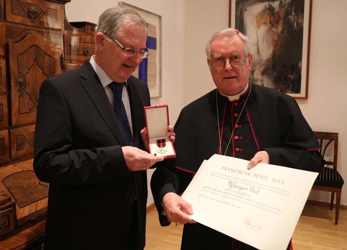 Würzburg/Rom (POW) Im Namen von Papst Franziskus hat Bischof Dr. Friedhelm Hofmann bei einer Feierstunde im Bischofshaus am Mittwoch, 22. Februar, Hans Dieter Arnold (70) aus Miltenberg und Professor Dr. Wolfgang Weiß (59) aus Würzburg zu Rittern des Silvesterordens ernannt.