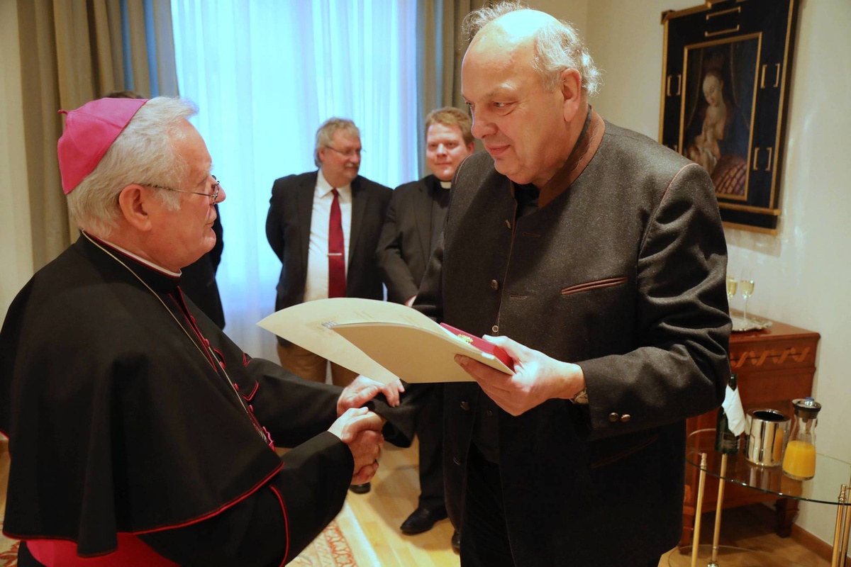 Hans Dieter Arnold, Jahrgang 1946, stammt aus Miltenberg. Seit 1977 wirkt er in der Kirchenverwaltung seiner Heimatstadt, wo er seit 1980 Kirchenpfleger und seit dieser Zeit auch Geschäftsführer des Kindergartens „Maria Hilf“ ist. Bei der Außen- und Innenrenovierung der Stadtpfarrkirche war er ebenso engagiert wie er es bei der Betreuung der sonstigen kirchlichen Gebäude ist. „Die Pfarrei profitiert hier von seinem finanziellen wie auch – aus der früheren Berufstätigkeit resultierenden – bautechnischen Sachverstand. Dabei gilt er als angenehmer und qualifizierter Ansprechpartner, welcher das Amt des Kirchenpflegers in enger Verbundenheit mit dem jeweiligen Pfarrer und mit hohem Engagement ausübt“, sagte Bischof Hofmann in der Laudatio. Seit 1991 vertritt Arnold zudem die Dekanate Miltenberg und Obernburg im Diözesan-Steuerausschuss. Darüber hinaus ist er Mitglied der Resonanzgruppe beim Projekt „Pastoral der Zukunft“ der Diözese Würzburg. Seit 1964 ist er Mitglied der Kolpingsfamilie Miltenberg und gehört seit 2001 dem örtlichen Vorstand an. Seit 1992 ist Arnold außerdem Mitglied des Caritasrats im Kreisverband Miltenberg. Seit 2011 ist er Vorsitzender des Caritas-Kreisverbands, der mit rund 220 hauptberuflichen Mitarbeiterinnen und Mitarbeitern sowie zahlreichen Ehrenamtlichen unter anderem ambulante Krankenpflege, Erziehungsberatung und Suchtberatung leistet. Ebenfalls seit 2011 gehört Arnold der Vertreterversammlung des Diözesan-Caritasverbands (DiCV) Würzburg an. Seit 2015 ist er darüber hinaus Mitglied des Caritasrats des DiCV und Vorsitzender der Personalkommission. In dieser Funktion leitete er das Verfahren zur Auswahl der weiteren Vorstandsmitglieder neben dem vom Bischof berufenen Vorstandsvorsitzenden. Auf Diözesanebene ist Arnold außerdem Mitglied der Finanzkommission des Caritasrats. Neben seinem kirchlichen Wirken gestaltete Arnold auch von 1991 bis 2002 als Stadtrat das gesellschaftliche Leben in Miltenberg mit. Mit der Übernahme des Amts als Geschäftsführer der Stadtwerke Miltenberg-Bürgstadt gab er dieses Mandat auf.