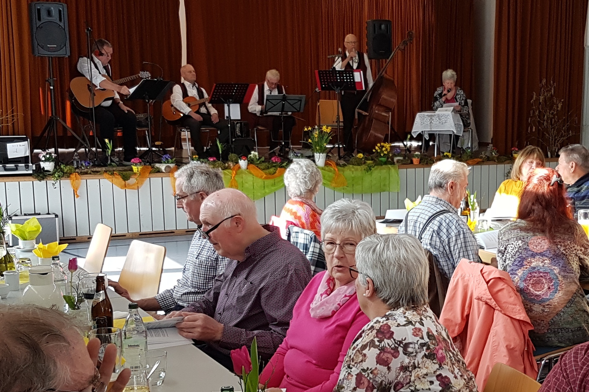 Das Singen wurde angeleitet durch die Eisenbacher Wirtshausmusikanten unter der Leitung von Günter Mann. Diese spielten beschwingt auf; sie hatten ein eigenes Liederbuch mitgebracht, so dass textsicher und frei mitgesungen werden konnte. Zwischen den Liedern gab Fr. Markert in ihrer „Poesie“ einige Späßchen zum Besten, welche meist die Problemchen beim Älterwerden auf die Schippe nahmen und für manche Lacher sorgten.