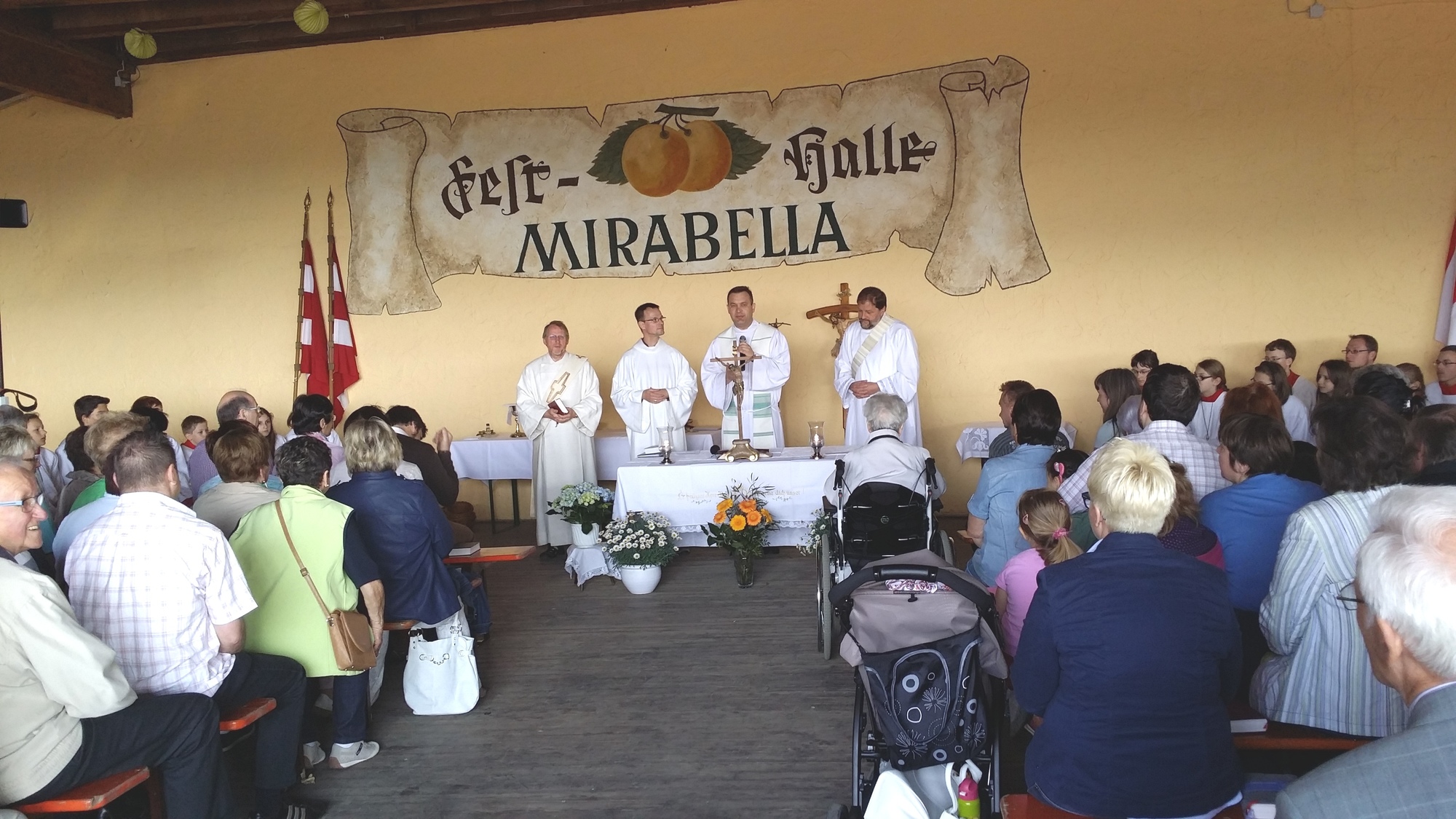 Pfarrvikar Mariusz Kowalski, der zusammen mit den Diakonen Thomas Seibert und Martin Höfer, sowie dem Pastoralreferenten Benjamin Riebel den Gottesdienst zelebrierte, begrüßte die zahlreichen Gläubigen in der Halle und auf dem Vorplatz, auch im Namen des erkrankten Pfarrers Manfred Jarosch. „Heute sind viele da, auch viele Kinder und viele Ministranten. Ist das nicht schön? Wir sind aus 3 Richtungen zusammengekommen, um Gottesdienst zu feiern, zu Jesus Christus, der unser Mittelpunkt ist.“